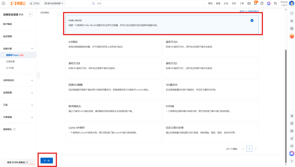 5.选择 Hello World 模板,然后点击页面底部的 下一步