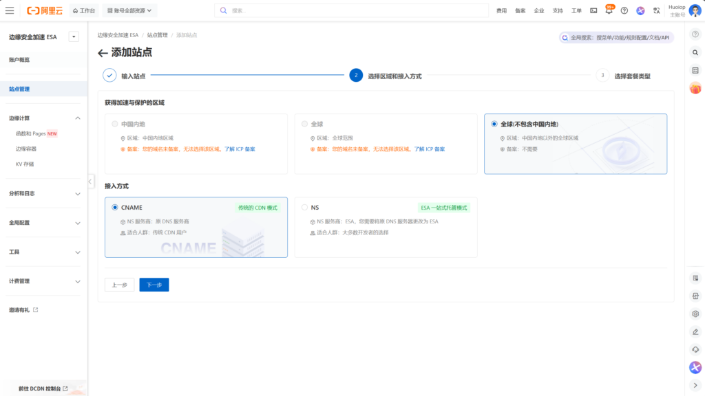 4.根据实际情况选择区域与接入方式(对于本文而言,建议选择 CNAME 接入方式)