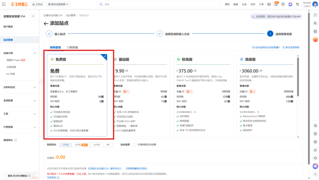 5.选择 免费版 套餐,根据提示完成 所属权校验 后完成添加