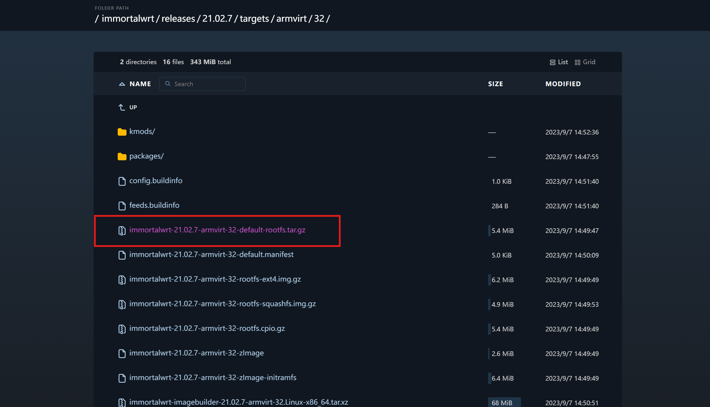访问 上海交通大学镜像站 / ImmortalWrt 官方下载站,进入 21.02.7/targets/armvirt/32/