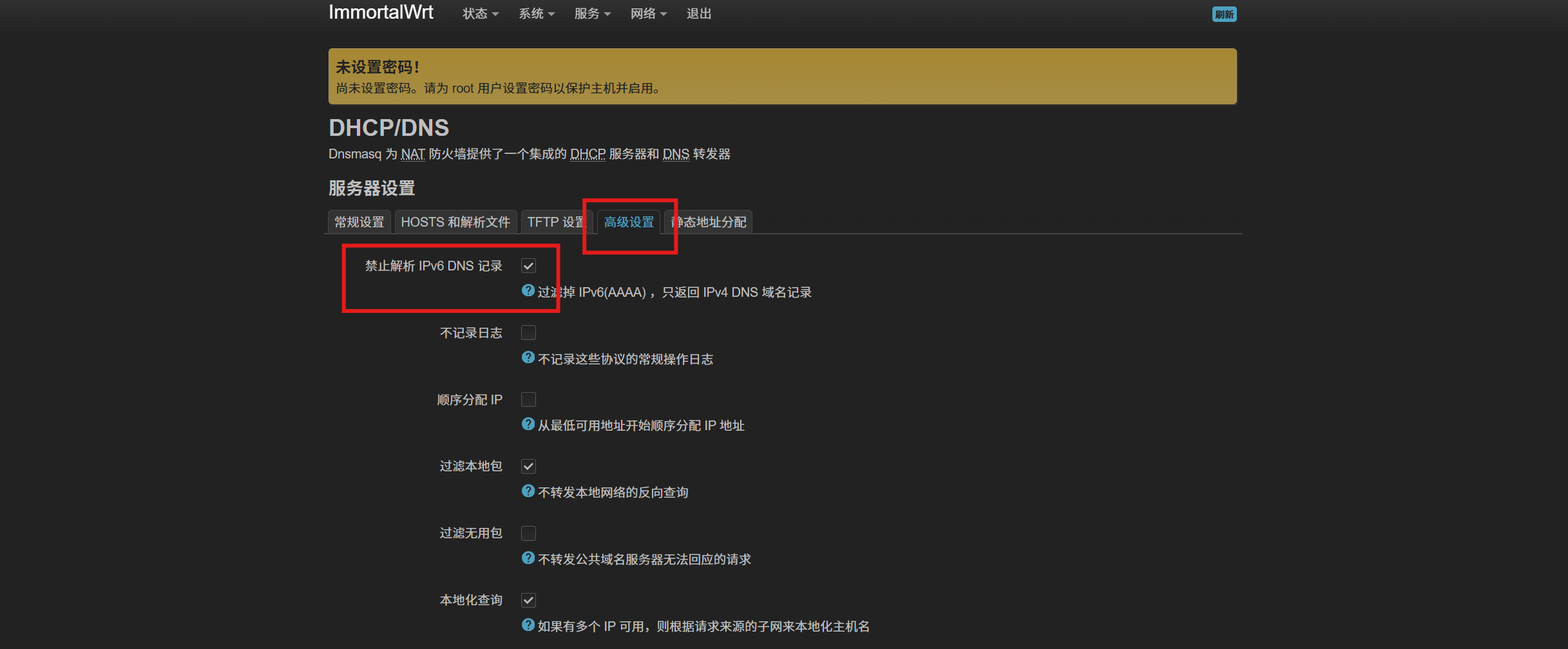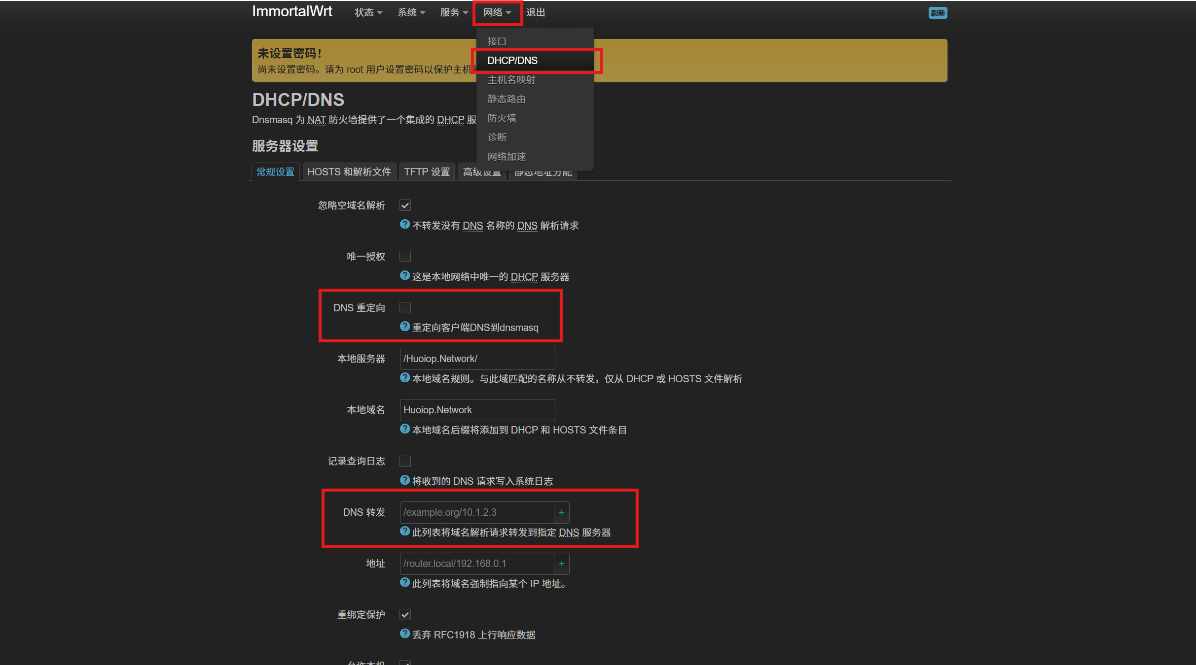 然后打开 网络-DHCP/DNS,将 DNS 重定向 关闭,且不要改动 DNS 转发 的值