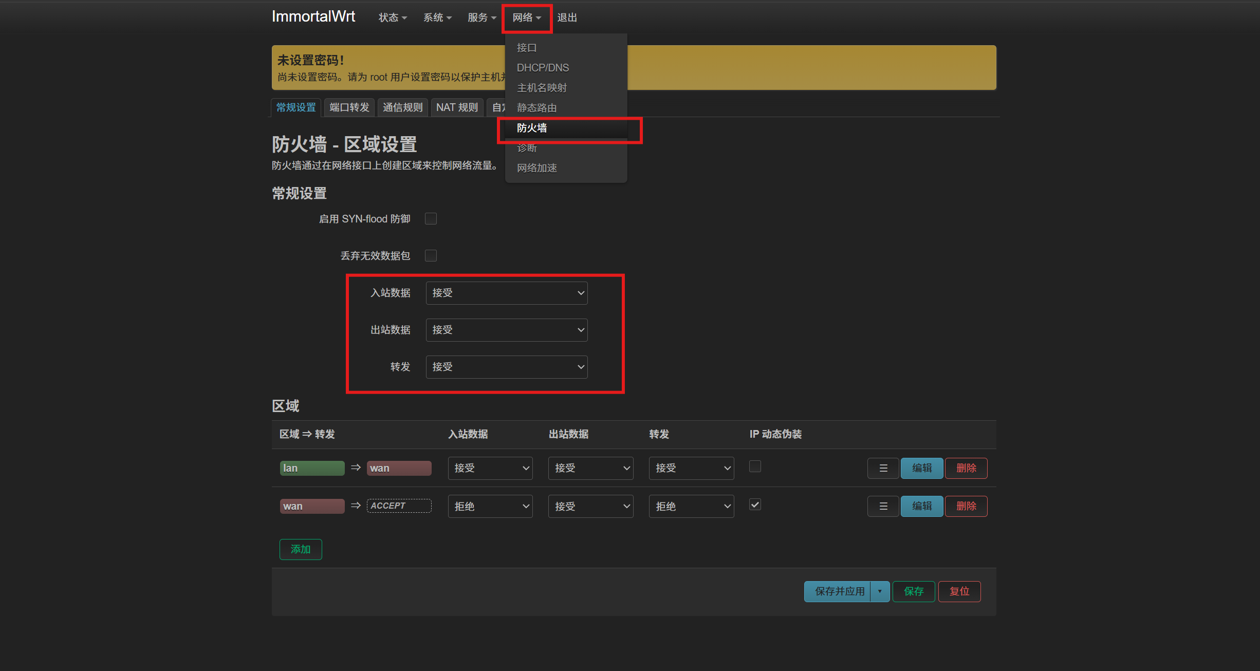 这种情况是因为 immortalwrt 版本过高,在高版本中(≥23.5.0)系统防火墙默认使用 fw4 导致的