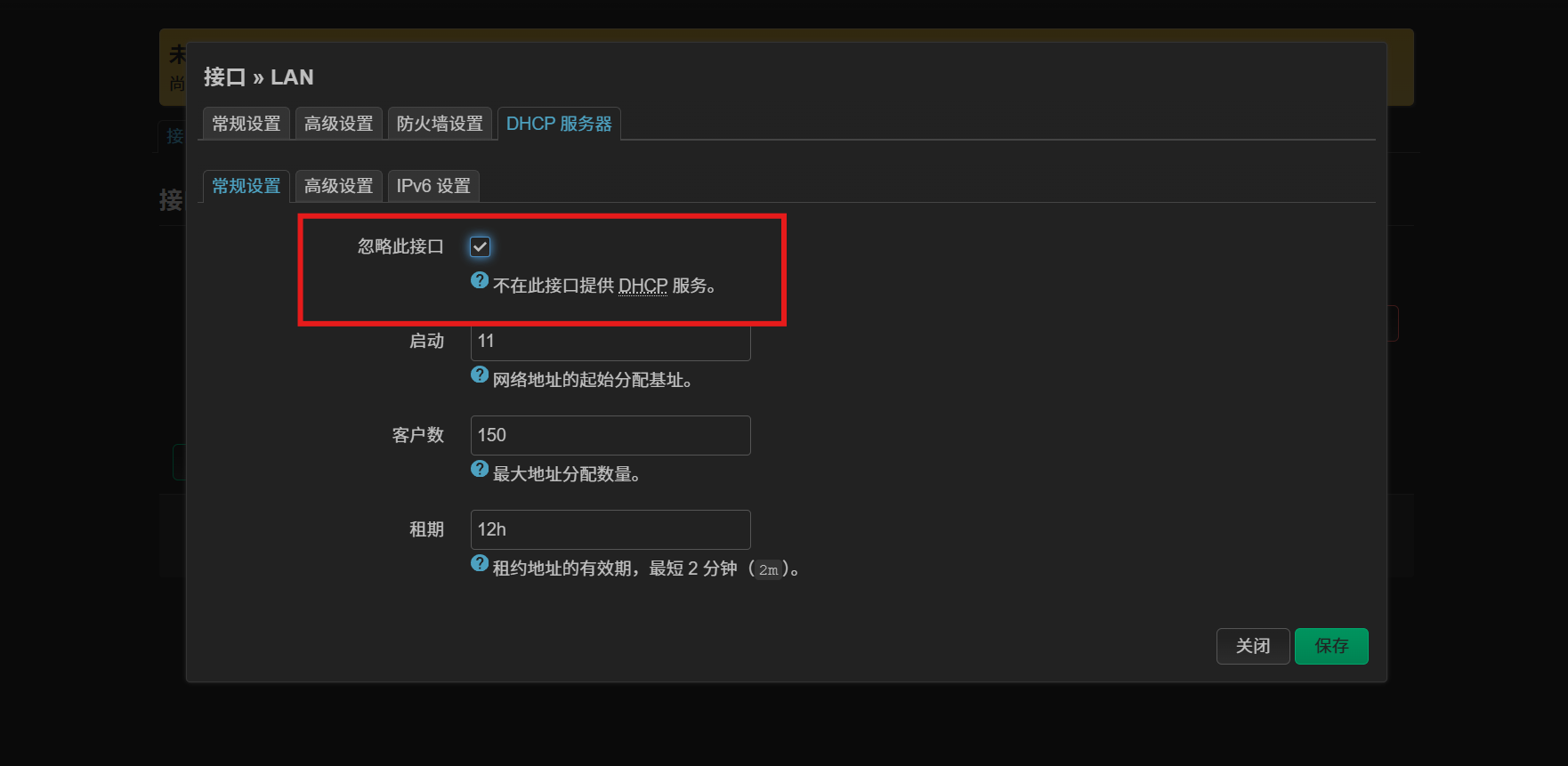 将 DHCP 服务器 页中的 忽略此接口 关闭