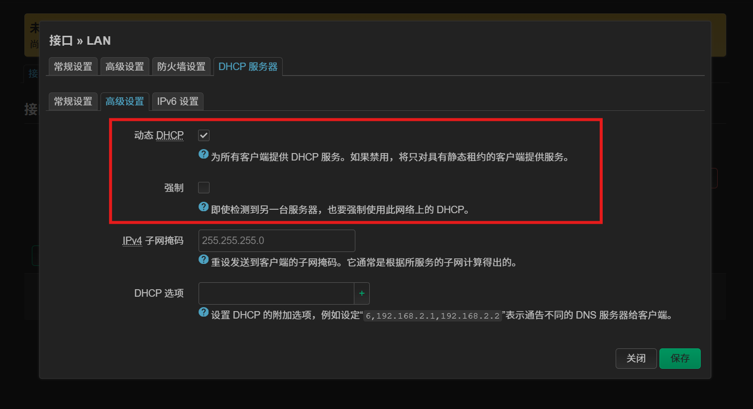 开启 高级设置 中的 动态 DHCP 及 强制