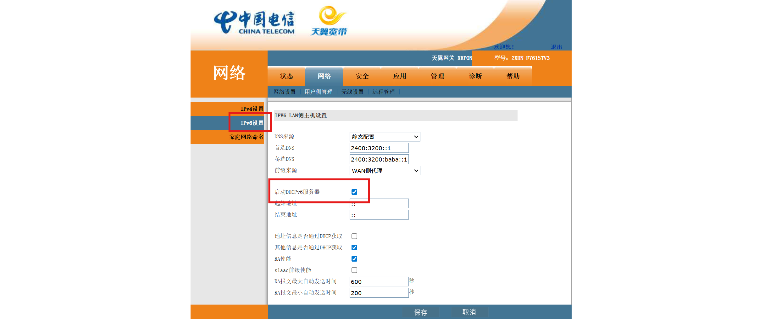 切换到 IPv6设置,关闭 启动DHCPv6服务器