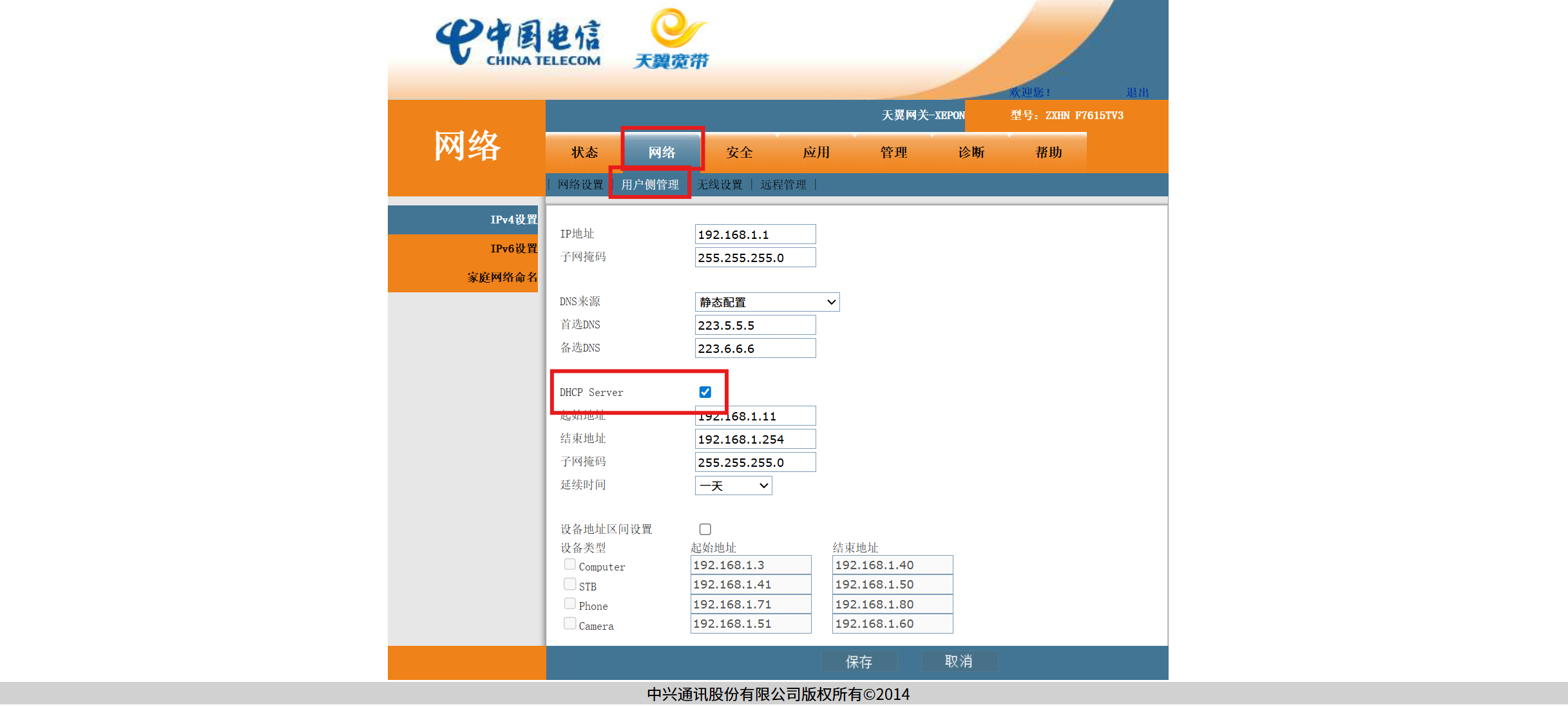 以 中兴天翼网关(型号ZXHN F7615TV3)为例