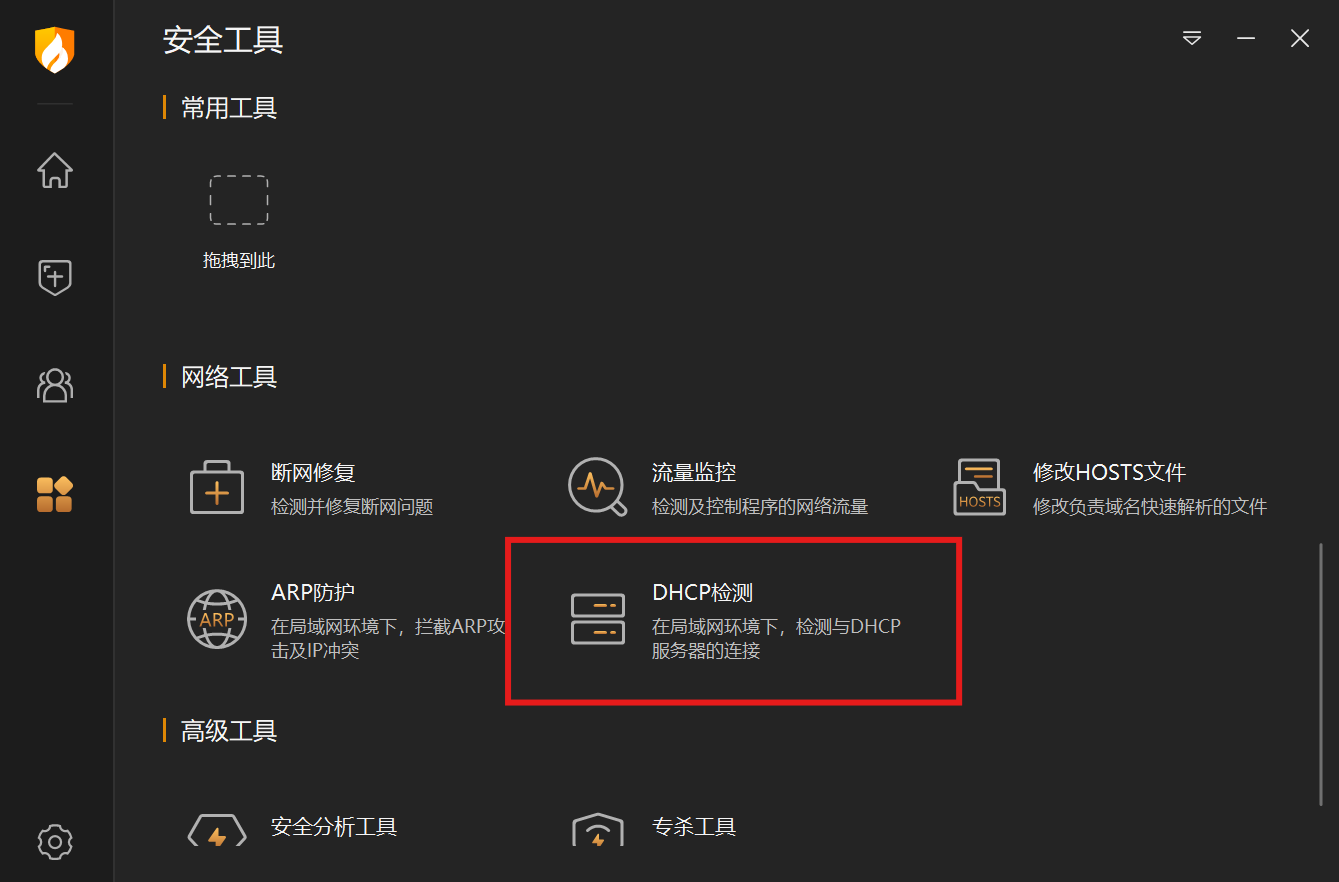 或者也可以借助火绒的 DHCP检测 工具查看当前活跃 DHCP服务器